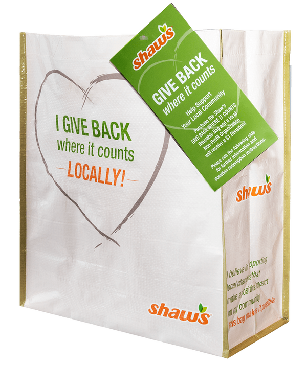 Welcome to the Shaw’s GIVE BACK WHERE IT COUNTS Reusable Bag Program! By simply making a $3.00 GIVE BACK Bag purchase, shoppers give $1 back to a local nonprofit selected monthly by store leadership. Use the resources to let your supporters know!